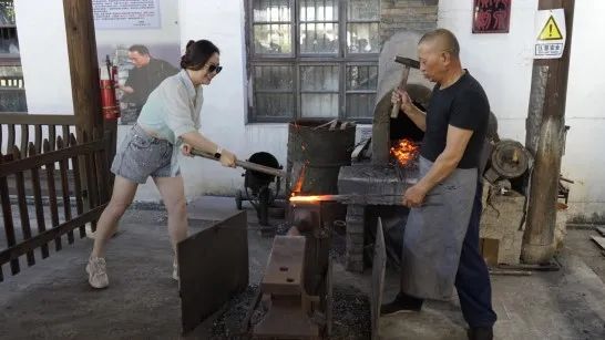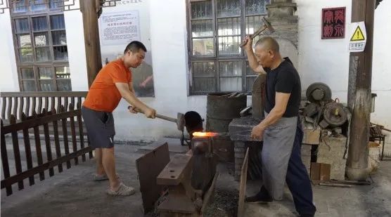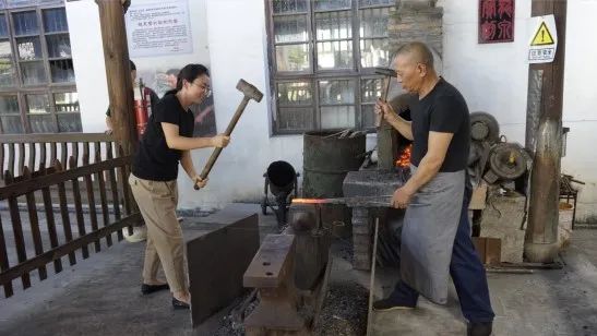 距离浙大龙泉分校旧址不远处,便是龙泉市宝剑厂。龙泉凭瓷生辉,又因剑得名。龙泉宝剑以“坚韧锋利、刚柔并寓、寒光逼人、纹饰巧致”四大特色而被誉为“天下第一剑”,代表了龙泉传统铸剑技艺的高超。老师们参观了铸剑工厂,欣赏了舞剑表演,更是亲自参与体验铸剑打铁,与老师傅互动,收获颇丰。