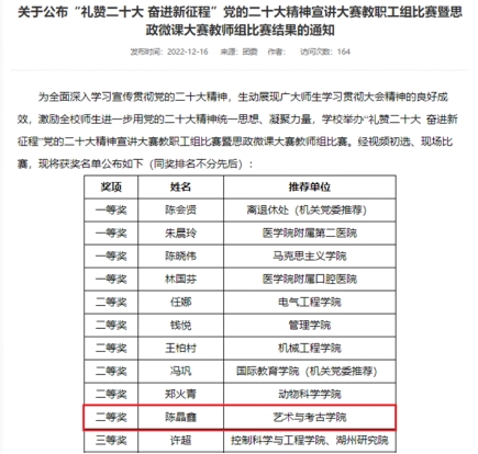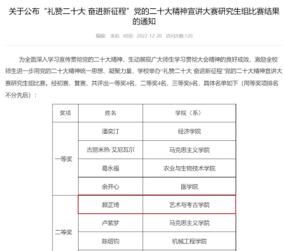 近日,浙江大学“礼赞二十大 奋进新征程”党的二十大精神宣讲大赛圆满落幕。我院考古与文博系教师陈晶鑫与2021级美术硕士生顾芷琦在十分激烈的初赛中脱颖而出、成功晋级决赛,最终分别荣获教师组二等奖和研究生组二等奖。