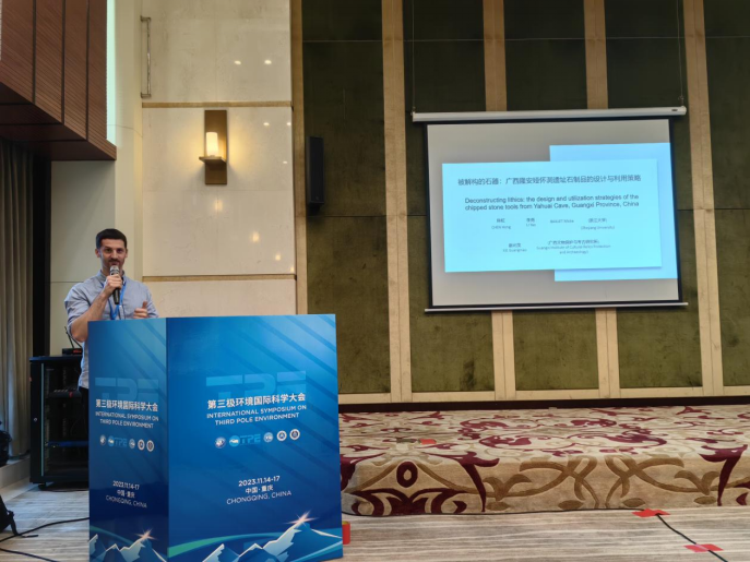 2023年11月14日至17日,由国家科技部和中科院指导,第三极环境(TPE)国际计划、第二青藏高原科学考察与研究队和中国科学院青藏高原研究所(ITPCAS)主办的“第三极环境国际科学大会”在重庆召开。青藏高原及其周边山脉所承载的冰量足以被视为继南极洲和北极洲之后的地球第三极,是气候变化最敏感、最直观的指标。该会议旨在协调国际科学人才,解决水、冰、空气、生态系统和人类之间的关系问题。我院考古与文博系博士后Mickaël Baillet受邀参加由中国科学院陈发虎院士与英国科学院Robin Dennell院士共同主持的“从锦绣华南到雪域高原——青藏高原与华南旧石器中晚期石器技术与人类演化”分会,代表陈虹教授课题组,以“被解构的石器:广西隆安娅怀洞遗址石制品的设计与利用策略”为题目作主题演讲。